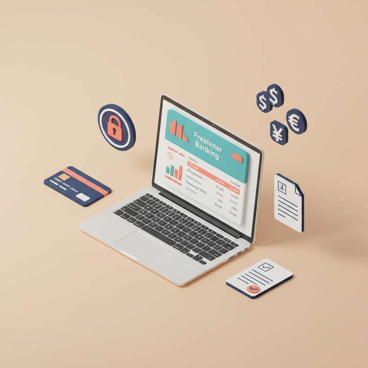 Freelancer9s digital banking workspace with business debit card, secure transactions, and invoice management icons